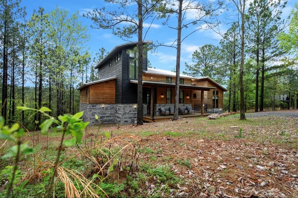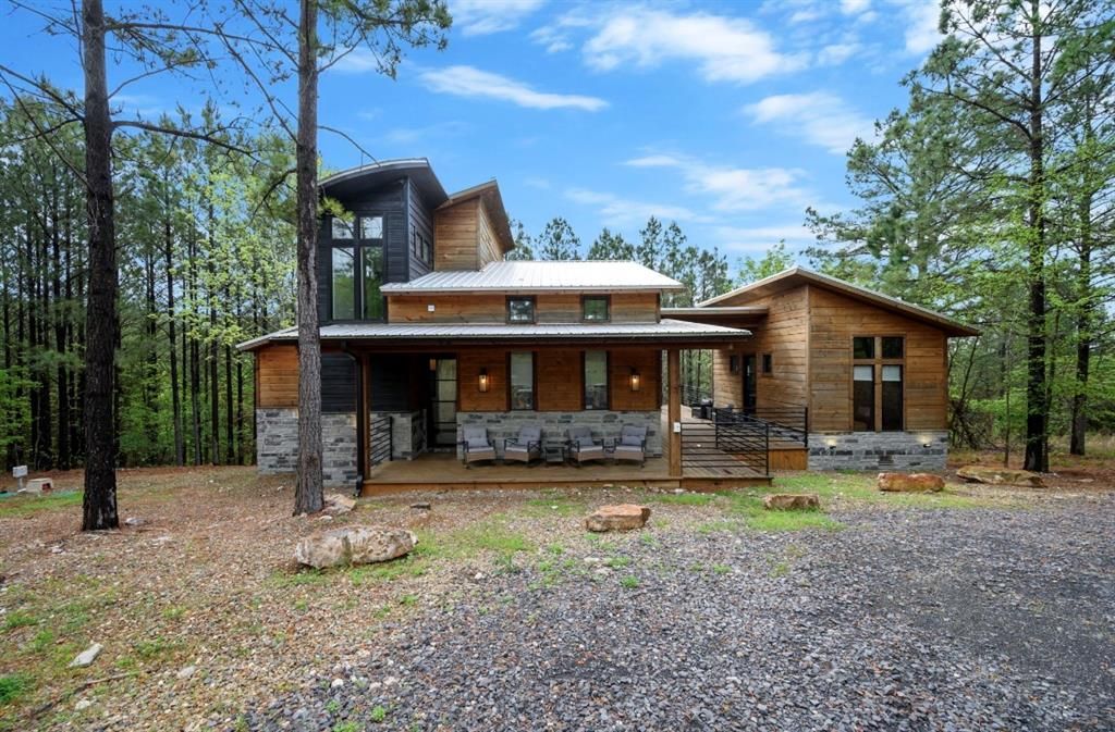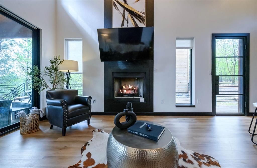 Introducing Oak & Ember Cabin-now available to tour.This beautifully designed 2 bedroom, 2.5 bath cabin offers an excellent opportunity for those seeking a short-term rental investment or second home in a highly desirable area. Set on a wooded lot, the stone, gray, and tan exterior delivers a clean, contemporary look with strong curb appeal. A unique breezeway connects the main cabin to a versatile bonus space currently used as a game room, with the option to convert to a bunk room for added guest capacity.Inside, the cabin features a striking modern design with a cohesive palette of white, black, and cognac tones. High ceilings and abundant windows fill the space with natural light, while the open-concept layout creates a comfortable flow for gathering and entertaining. The living room is anchored by a floor-to-ceiling black fireplace, serving as a bold focal point, with large sliding glass doors leading directly to the back deck.The kitchen is both functional and stylish, finished with custom cognac and black cabinetry and well-planned workspace. A contemporary glass front door enhances the natural light and overall design.The primary suite showcases a freestanding soaking tub paired with another fireplace, creating a relaxing retreat. The bathroom offers a spa-like feel with a large, beautifully tiled walk-in shower. Honeycomb window treatments and thoughtfully selected light fixtures add to the home's elevated design. A second bedroom upstairs provides additional comfort and privacy.The detached game room includes arcade games, a foosball table, and a secondary seating area-ideal for entertaining guests. Outdoors, enjoy a covered deck with hot tub, a scenic backyard, and a staircase leading to a fire pit area.Oak & Ember Cabin offers style, functionality, and strong rental appeal-an excellent addition to any portfolio.